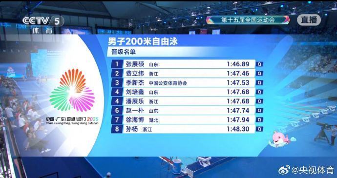 第十五届全国锦标赛男子200米自由泳半决赛,张占硕以1分46.89秒的成绩获得第一名,潘振乐以1分47秒的成绩紧随其后。...