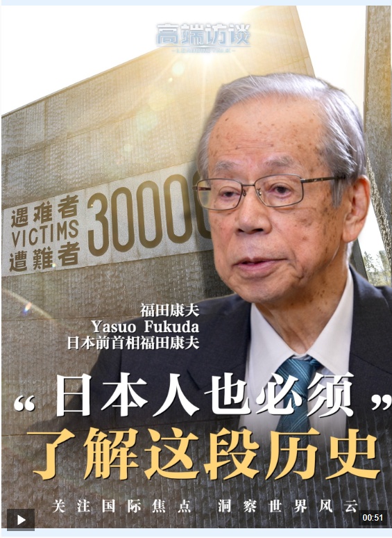 日本前首相福田康夫2018年参观日军南京大屠杀遇难同胞纪念馆,是第四位参观的日本前首相。他在接受央视《高端访谈》专访时表示,日本民众也需要了解这段历史。前首相福田康夫:历史永远不会消失。未来的日本人需要了解这些过去的事件,参观历史遗迹,回顾历史。我们深知此类努力的必要性。因为这是历史,历史是无法抹去的。日本人也需要了解这段历史。我们也需要认真思考历史上发生的事情,我们需要这样的时间。我认为我的南京之行给了我这个机会。
